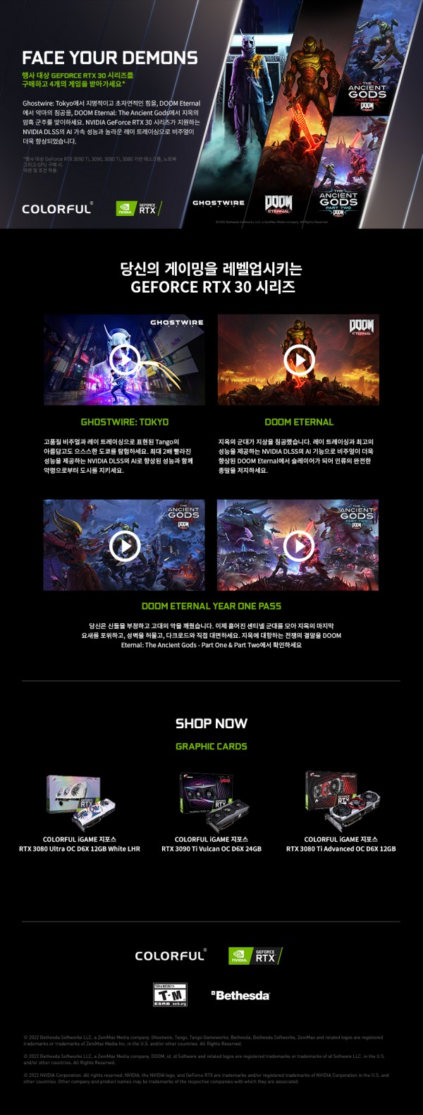 웨이코스가 유통하는 컬러풀의 "GeForce RTX 3090 Ti ~ RTX 3080" 그래픽카드 제품 구매자를 대상으로 Ghostwire: Tokyo, DOOM Eternal (DLC 2종 포함) 게임코드를 증정하는 프로모션을 진행합니다. 아래에 안내된 사항을 따라 구매하신 제품 정보를 입력해주시면 확인 후 게임을 다운 받으실 수 있는 리딤코드를 메일로 발송해 드립니다.