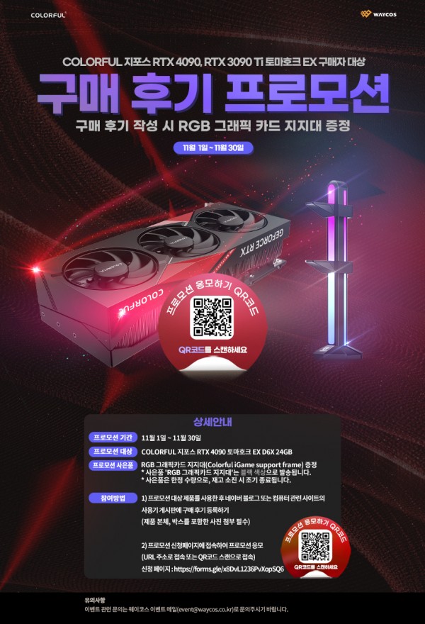 컬러풀 그래픽카드 공식 유통사인 ㈜웨이코스는 "컬러풀 지포스 RTX 4090 토마호크 EX" 제품 구매자를 대상으로 구매 후기 작성 시 'RGB 그래픽카드 지지대'를 증정하는 프로모션을 진행합니다. 프로모션 기간 중 행사 대상 제품을 구매하셨다면, 다나와 소비자 사용기 또는 커뮤니티 유저사용기 게시판에서 구매 후기를 등록하신 후 프로모션을 신청해주세요. 신청 내용을 확인한 후 아래에서 안내 드리는 사은품을 발송합니다.