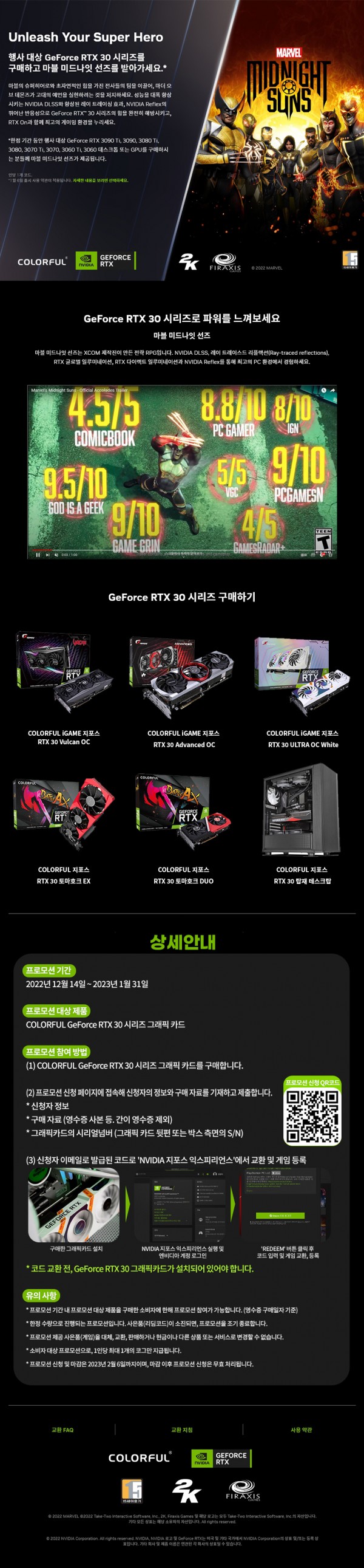 웨이코스가 유통하는 컬러풀의 "GeForce RTX 3090 Ti ~ RTX 3060" 그래픽카드 제품 구매자를 대상으로 Marvel’s Midnight Suns 게임 코드를 증정하는 프로모션을 진행합니다. 아래에 안내된 사항을 따라 구매하신 제품 정보를 입력해주시면 확인 후 게임을 다운 받으실 수 있는 리딤 코드를 메일로 발송해 드립니다.