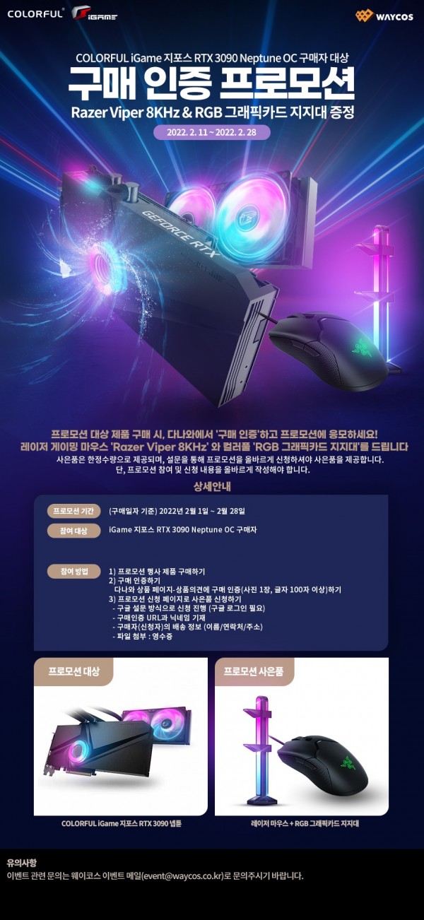 컬러풀 그래픽카드 공식 유통사인 ㈜웨이코스는 "컬러풀 iGame 지포스 RTX 3090 Neptune OC" 구매자를 대상으로 구매 인증 시 'Razer Viper 8KHz + RGB 그래픽카드 지지대'를 증정하는 프로모션을 진행합니다.