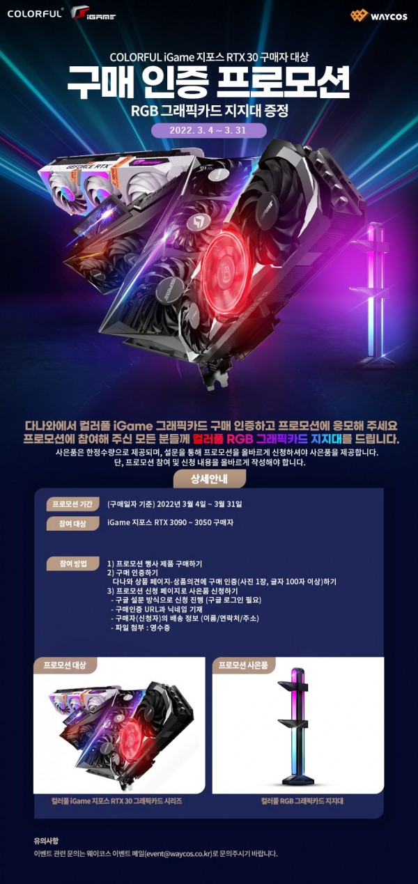 컬러풀 그래픽카드 공식 유통사인 ㈜웨이코스는 "컬러풀 iGame 지포스 RTX 3090 ~ 3050" 제품 구매자를 대상으로 구매 인증 시 'RGB 그래픽카드 지지대'를 증정하는 프로모션을 진행합니다.