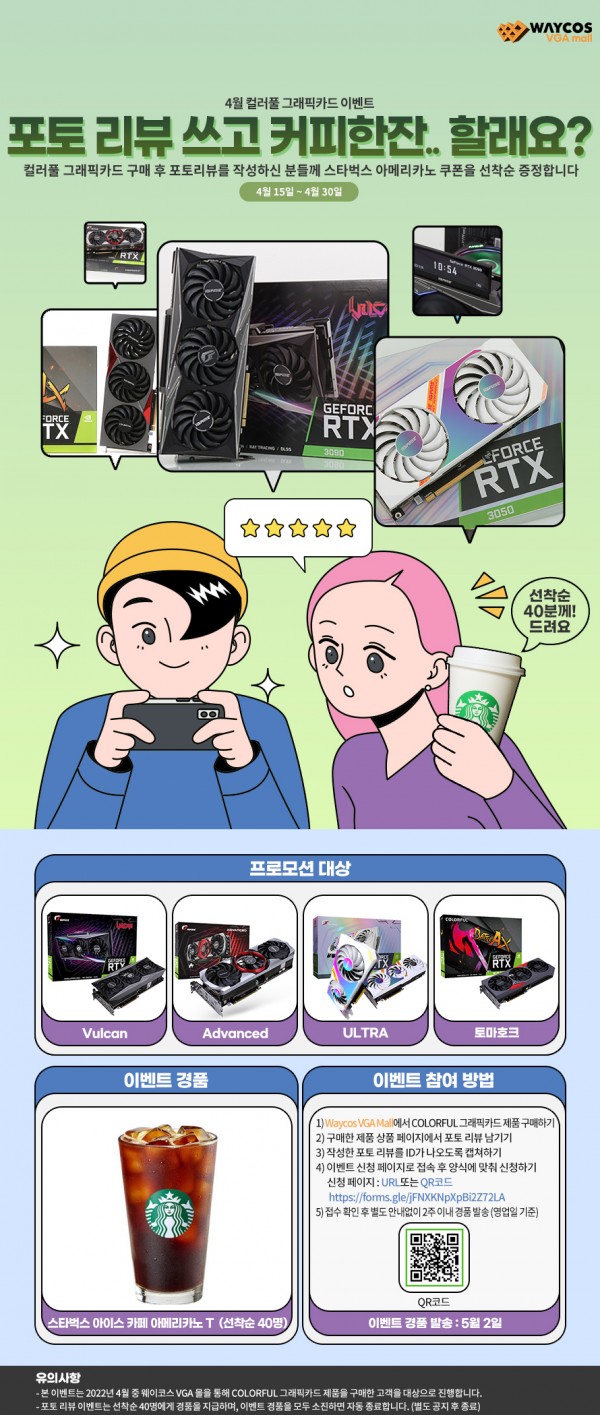 2022년 4월 15일부터 (*또는 선착순 40명 응모 완료 시 조기 종료), 네이버 스토어 'Waycos VGA Mall'에서 4월 컬러풀 그래픽카드 구매자를 대상으로 포토 리뷰 이벤트를 진행합니다. 4월 30일까지