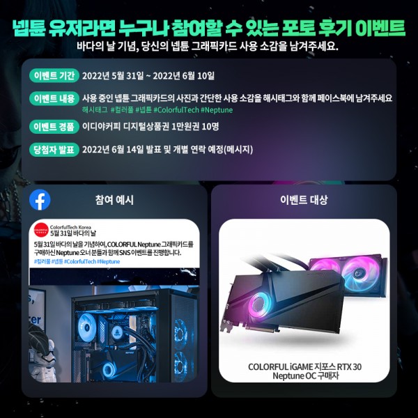 * 이벤트 참여방법 : 사용 중인 컬러풀 넵튠 그래픽카드의 사진과 간단한 사용 소감을 해시태그와 함께 페이스북에 남겨주세요.