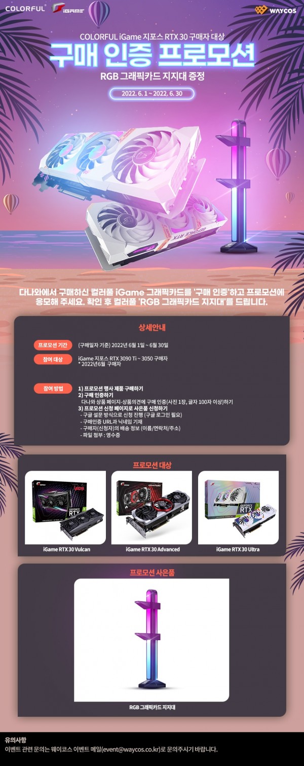 컬러풀 그래픽카드 공식 유통사인 ㈜웨이코스는 "컬러풀 iGame 지포스 RTX 30 Series" 제품 구매자를 대상으로 구매 인증 시 'RGB 그래픽카드 지지대'를 증정하는 프로모션을 진행합니다. 프로모션 기간 중 행사 대상 제품을 구매하셨다면, 다나와 상품 의견에서 구매 인증을 진행하신 후 프로모션을 신청해주세요. 신청 내용을 확인한 후 아래에서 안내 드리는 사은품을 발송합니다.