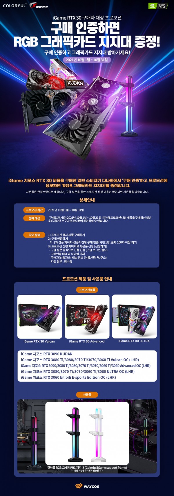 컬러풀 그래픽카드 공식 유통사인 ㈜웨이코스는 "컬러풀 iGame 지포스 RTX 30 시리즈" 구매자를 대상으로 구매 인증 시 'RGB 그래픽카드 지지대'를 증정하는 프로모션을 진행합니다.