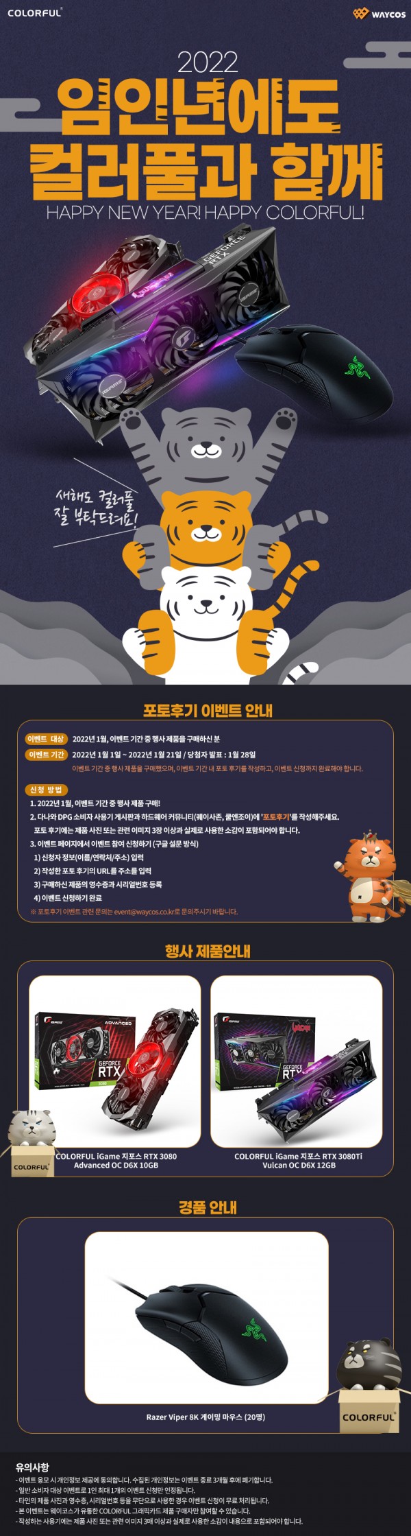 컬러풀 그래픽카드 공식 유통사인 ㈜웨이코스는 2022년 임인년 새해를 맞이해 1월 판매 행사를 통해 컬러풀 그래픽카드를 구매하신 고객님을 대상으로 '컬러풀 포토후기 이벤트'를 실시합니다!