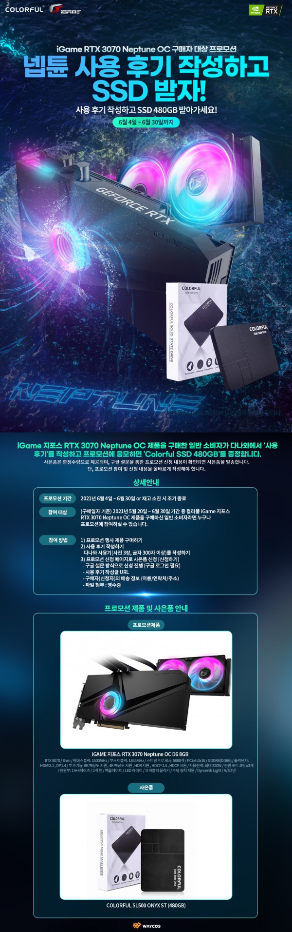 컬러풀 그래픽카드 공식 유통사인 ㈜웨이코스는 "컬러풀 iGame 지포스 RTX 3070 Neptune OC" 구매자를 대상으로 사용 후기 작성 시 'Colorful SSD 480GB'를 증정하는 프로모션을 진행합니다.