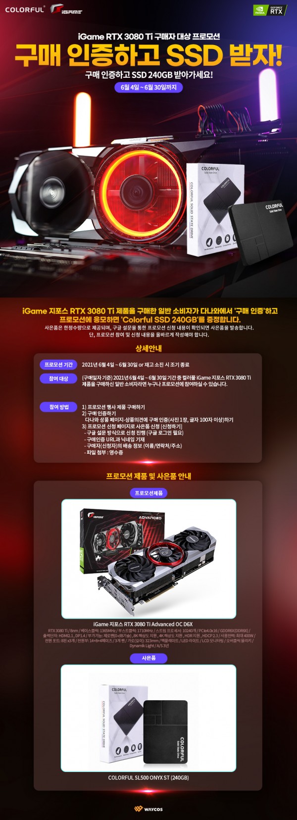 컬러풀 그래픽카드 공식 유통사인 ㈜웨이코스는 신제품 "컬러풀 iGame 지포스 RTX 3080 Ti" 구매자를 대상으로 구매 인증 시 'SSD 240GB'를 증정하는 프로모션을 진행합니다.