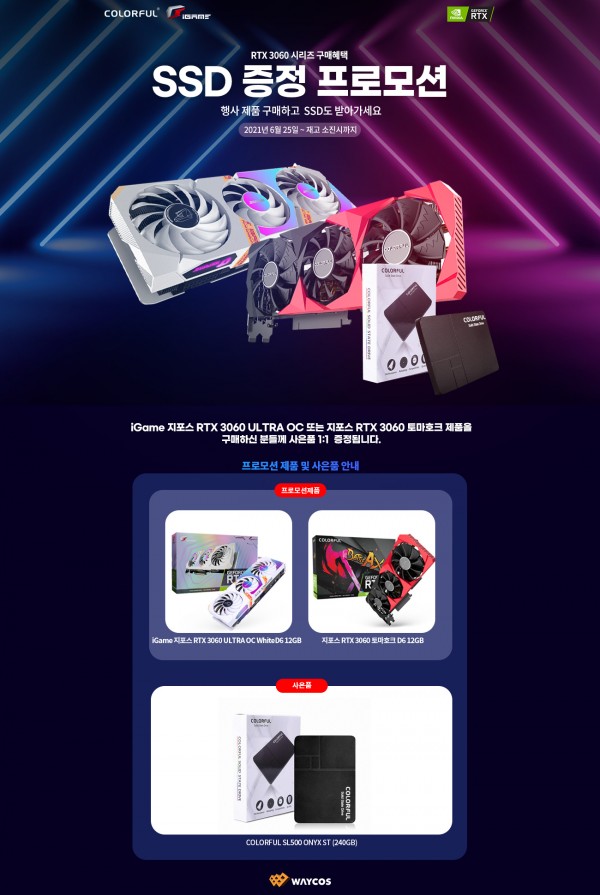 - 프로모션 기간 중 "컬러풀 iGame 지포스 RTX 3060 ULTRA OC White"와 '컬러풀 지포스 RTX 3060 토마호크" 제품을 구매하는 일반소비자에게 사은품으로 컬러풀 'SSD 240GB'을 증정합니다.