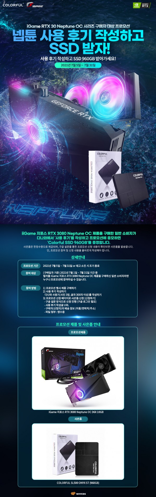 컬러풀 그래픽카드 공식 유통사인 ㈜웨이코스는 "컬러풀 iGame 지포스 RTX 3080 Neptune OC" 구매자를 대상으로 사용 후기 작성 시 'Colorful SSD 960GB'를 증정하는 프로모션을 진행합니다.