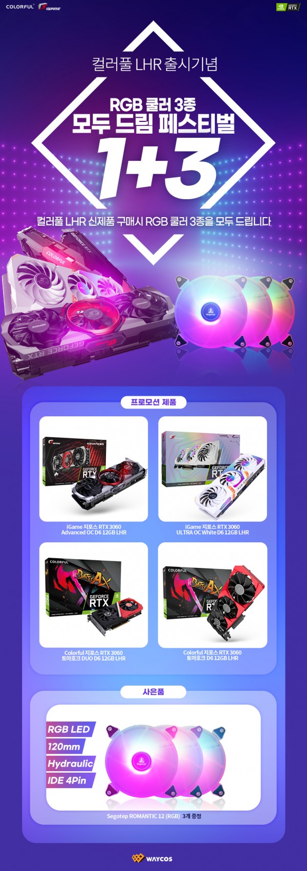 - 프로모션 기간 중 "컬러풀 iGame 지포스 RTX 3060 ULTRA OC White LHR", '컬러풀 지포스 RTX 3060 토마호크 LHR", '컬러풀 지포스 RTX 3060 토마호크 DUO LHR" 제품을 구매하는 일반소비자에게 사은품으로 120mm 사이즈 RGB 시스템 쿨러 3개를 증정합니다.