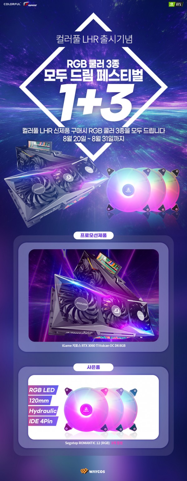 - 프로모션 기간 중 "컬러풀 iGame 지포스 RTX 3060 Ti Vulcan OC LHR" 제품을 구매하는 일반소비자에게 사은품으로 120mm 사이즈 RGB 시스템 쿨러 3개를 증정합니다.