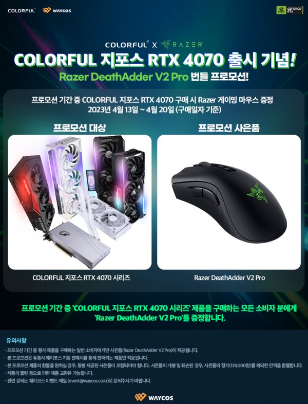 컬러풀 그래픽카드 공식 유통사인 ㈜웨이코스는 "컬러풀 iGame 지포스 RTX 4070 시리즈"의 출시를 기념하여, 구매자를 대상으로 'Razer DeathAdder V2 Pro'를 증정하는 프로모션을 진행합니다. 프로모션 기간 중 지정 판매처에서 행사 대상 제품을 구매하면, 프로모션 사은품이 동봉 제공됩니다.