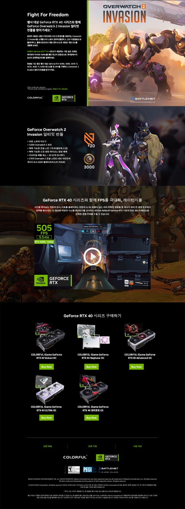 웨이코스가 유통하는 컬러풀(COLORFUL)의 "GeForce RTX 40 시리즈" 그래픽카드 제품 구매자를 대상으로 GeForce Overwatch 2 Invasion 얼티밋 번들 코드를 제공하는 프로모션을 진행합니다.