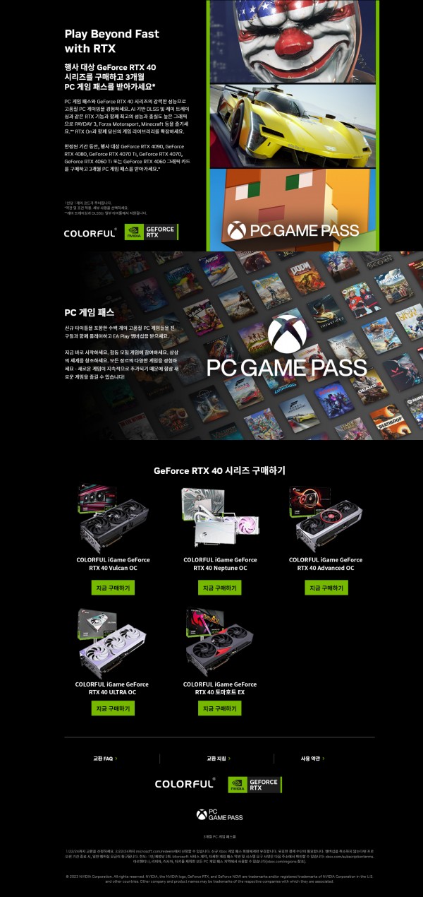 웨이코스가 유통하는 컬러풀(COLORFUL)의 "GeForce RTX 40 시리즈" 그래픽카드 제품 구매자를 대상으로 PC Game Pass(3개월) 코드를 제공하는 프로모션을 진행합니다.