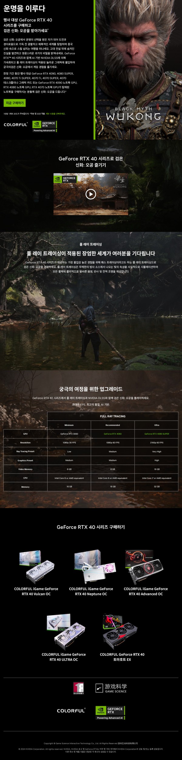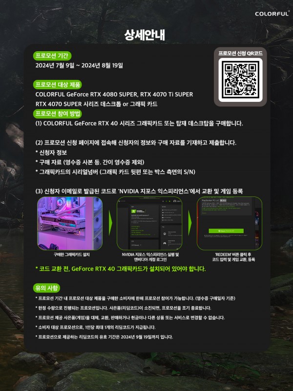 웨이코스가 유통하는 컬러풀(COLORFUL)의 "GeForce RTX 40 SUPER 시리즈" 그래픽카드 제품 구매자를 대상으로 검은 신화: 오공(Black Myth: Wukong) 게임 코드를 제공하는 프로모션을 진행합니다.
